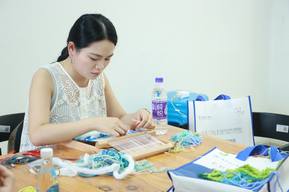 三位教师带领学员学习传统手工编织的手法,指导大家运用不同的创作材料进行实践实验,在过程中针对性辅导学员的编织手法及材料选择方法。课程最后,三位教师对学员的作品进行点评,并共同探讨日后如何将其与中小学美术课程相结合运用。