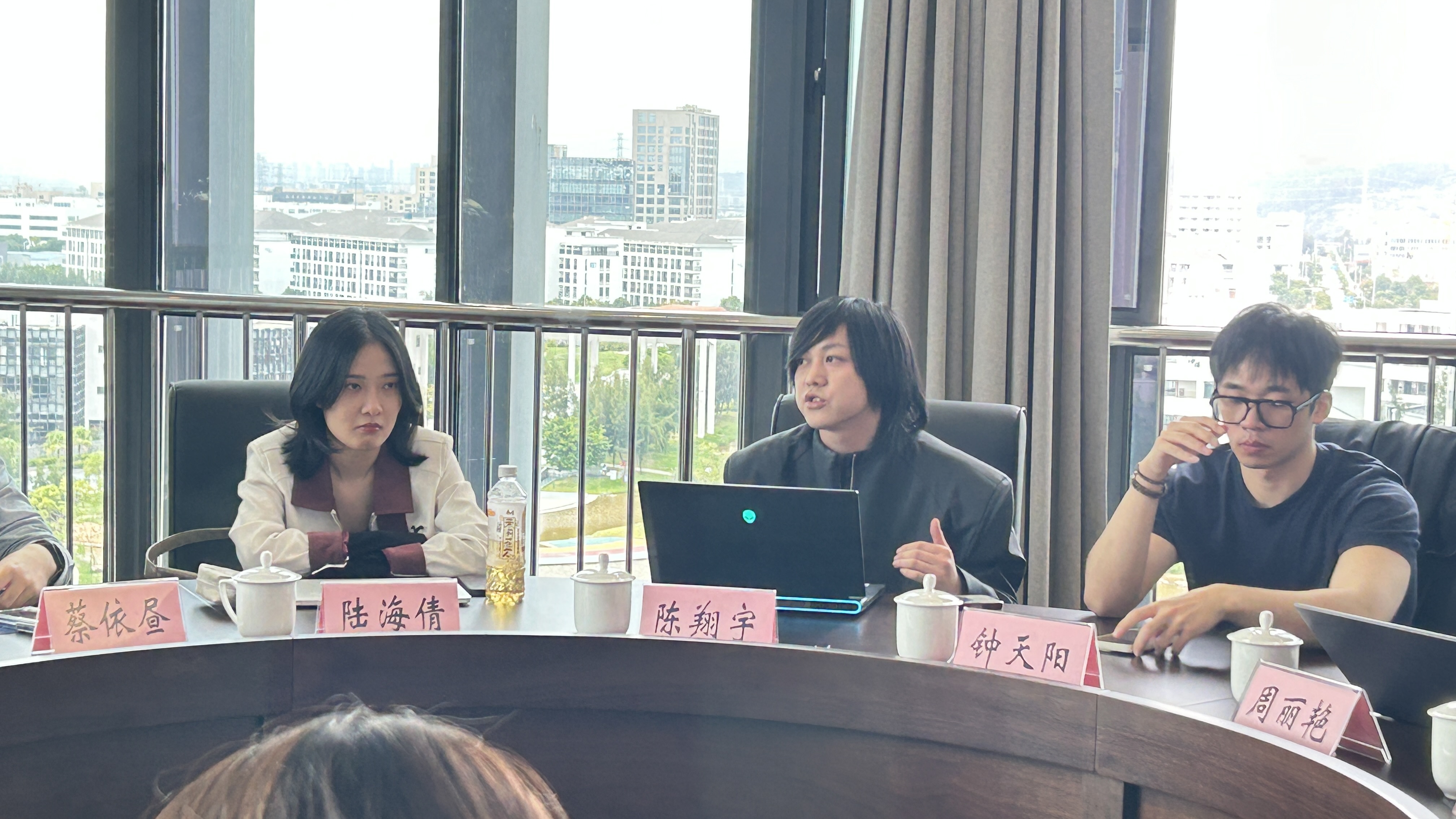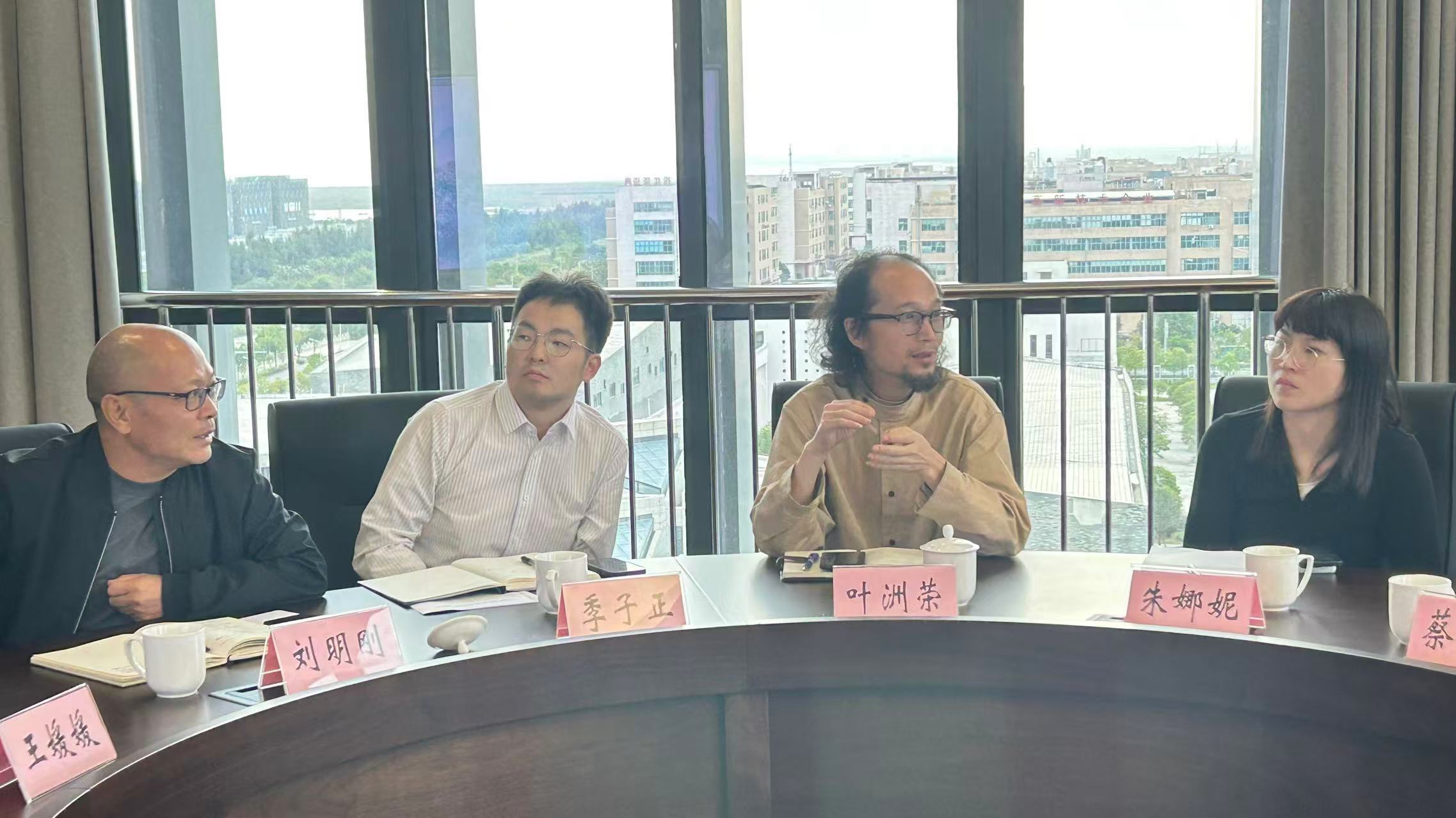 参观结束后,双方移步至行政楼902会议室,围绕“异源共生、智创未来——AI时代的设计革命与教育进化”主题展开座谈。座谈会由设计艺术学院刘明刚院长主持。温州理工学院党委委员、科研处处长王媛媛,设计艺术学院领导班子成员、专业教师代表,以及异类Outliers创始人陈翔宇一行共同参与交流。